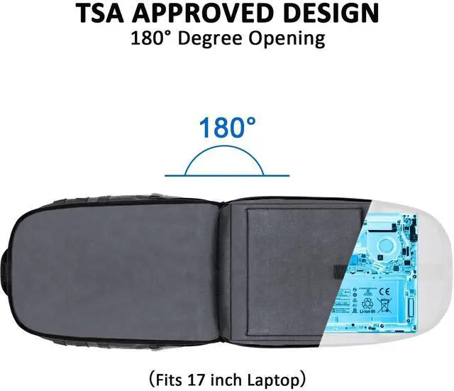 Multiple Compartments: Airline approved size ( 19.5" x 12.5" x 8"), 32 L capacity. 17.3 inch large laptop backpack features TSA laptop compartment fits under 17 inch laptop, it can be laid flat at 180 degree get through airport security quickly. 17 in laptop backpack has a large main compartment, quick access front organizer compartment built-in key hook and sunglasses pocket, dual bottle holders ^^