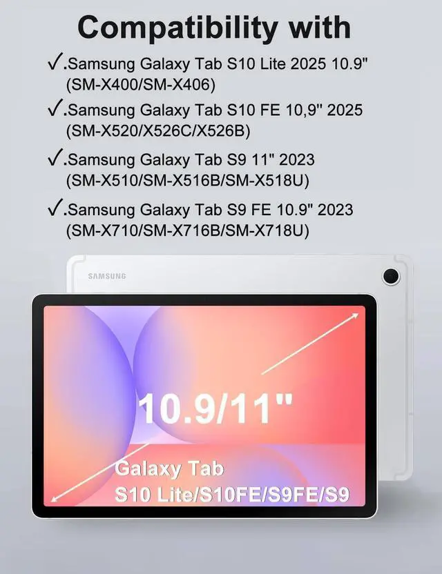 Galaxy tab 10.9 /11 inch keyboard Case - This Keyboard Case is Only Compatible with Samsung Galaxy Tab S10 Lite 10.9" 2025 (SM-X400/X406), Samsung Galaxy Tab S10 FE 10, 9'' 2025 (SM-X520/X526C/X526B), Samsung galaxy Tab Samsung Galaxy Tab S9 11'' 2023 (SM-X710 / X716B / X718U), Samsung Galaxy Tab S9 FE 10, 9'' 2023 (SM-X510/X516B), Please check your tablet model before purchasing! ^^ Multiple Viewing Angles - Galaxy Tab S10 Lite case with keyboard has 3 grooves to adjust the viewing angle as you like, make your tablet stand steadily. Perfect for studying, working, writing, reading or watching videos ^^ Powerful Battery & Built-in Pencil Holder - Built-in Strong battery with energy-saving mode, it only takes 2-3 hours to fully charge, work at least 80 hours and stand by for more than 30 days.