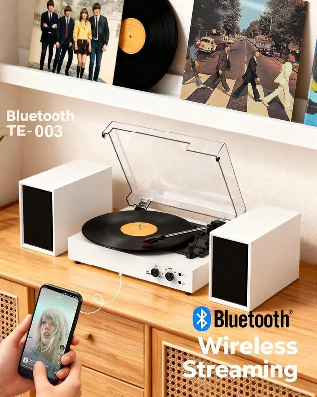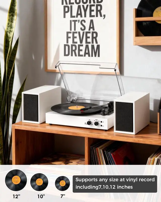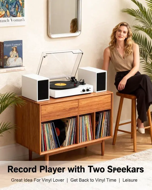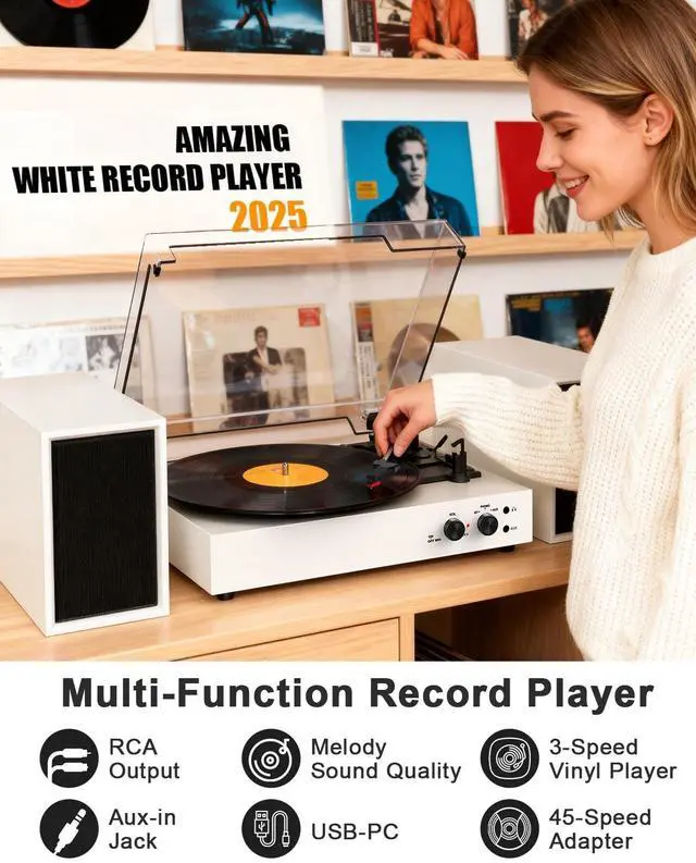 EXTERNAL STEREO SPEAKERS FOR IMMERSIVE SOUND: Enjoy a superior audio experience with dual external stereo speakers. This setup provides wider sound separation and richer, more powerful audio than built-in alternatives, filling your room with clear, immersive sound ^^ 3 SPEEDS TURNTABLE for 3-SIZES RECORDSWith removable protective dust cover and auto-stop function included, the turntable play your entire vinyl collection (7", 10", 12") with the precision 3-speed (33/45/78 RPM) turntable. Housed in a stylish white vintage design, this player adds a touch of timeless elegance to any space. ^^ WIRELESS BLUETOOTH MUSIC FREE TIME - Wireless Turntable with speaker stream music wirelessly from your smartphone, tablet, or laptop via Bluetooth. For non-Bluetooth devices, use the AUX input jack, or connect to a larger sound system using the RCA output for enhanced audio flexibility. ^^ PC CONVERT VINYL TO DIGITAL MP3s- Save your precious vinyl collection by converting it to digital files. The PC recording function allows you to easily transfer your records to your computer and save them as MP3s for listening anywhere. ^^ ALL-IN-ONE RECORD PLAYER SYSTEM-- This all-in-one Record player with speakers is perfect music system for beginners and makes a fantastic gift.