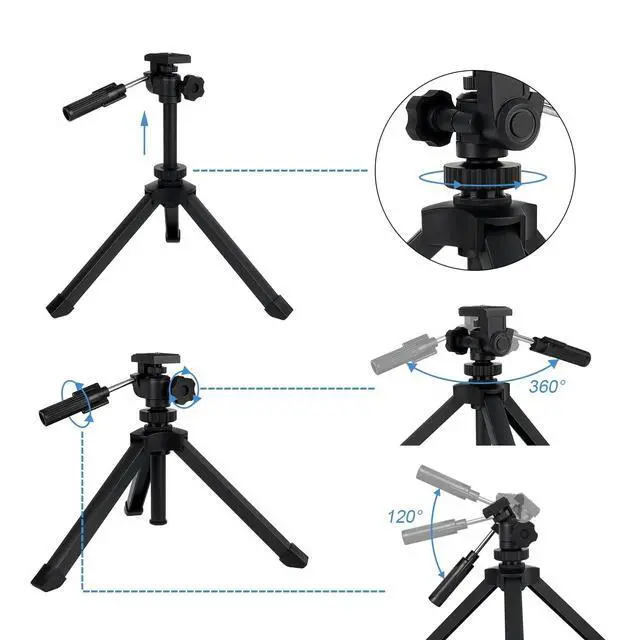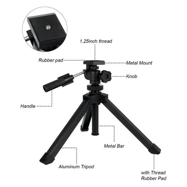 Aluminum alloy material; SV146 tabletop tripod is made of aluminum alloy and is durable; Good material can extend the life of the product ^^ SV146 tabletop tripod provide 360-Degree Horizontal Rotate and 120-Degree Vertical direction Rotate; rotate the locking ring counterclockwise to adjust the angel of head and clockwise to lock; It is convenient for you to adjust and watch from other angles ^^ Light weight and very sturdy; Weight is just 21.75 oz; supports device up to 10 lb; Let you carry it while you don't have to worry about bearing weight ^^ The non-slip pad on the top enhances the grip between the device and tripod, while the rubber pads under each leg keep it from damaging any surface or from slipping ^^ Adjustable Height; Extend the legs from 10.04 inches to 13.66 inches; Can tailor the height of the tripod as needed