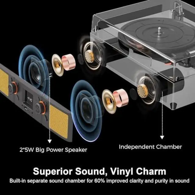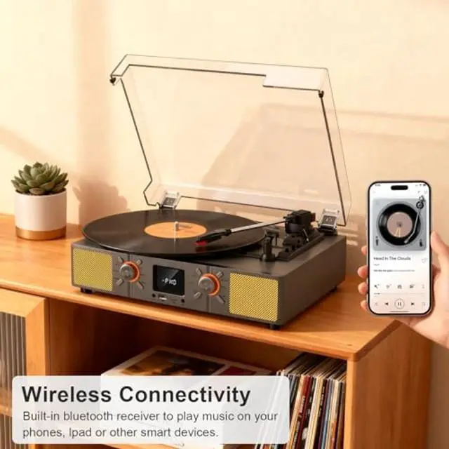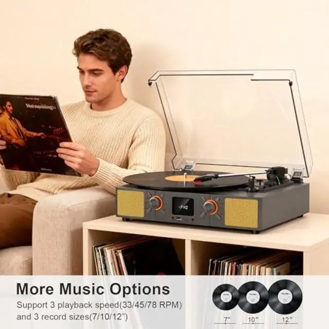 Bluetooth Connectivity and Wireless StreamingThis Bluetooth record player lets you wirelessly play music from your smartphone, tablet, or laptop. Built-in stereo speakers deliver stereo sound, allowing you to fully enjoy your digital playlists. ^^ Built-in Speakers and Multiple Output OptionsEquipped with dual stereo speakers and independent chambers, the sound quality is clear and rich. Connect external speakers via the RCA outputs, wired devices using the AUX input, or enjoy private listening via the headphone jack. ^^ Three-Speed Belt-Drive TurntableCompatible with 33, 45, and 78 RPM vinyl records.