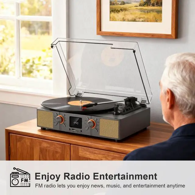 The belt drive system ensures stable rotation and minimizes vibration, allowing you to smoothly play classic LPs and singles. ^^ USB Recording, FM Radio, and Auto-StopRecord your records directly to a USB drive without a computer. For everyday listening, switch to the FM radio. The auto-stop function protects your records at the end of playback. ^^ Retro Design and Home Decor GiftThis turntable features a vintage-inspired design that complements any home decor. Perfect for vinyl lovers, beginners, or as a thoughtful gift for birthdays, holidays, and special occasions.