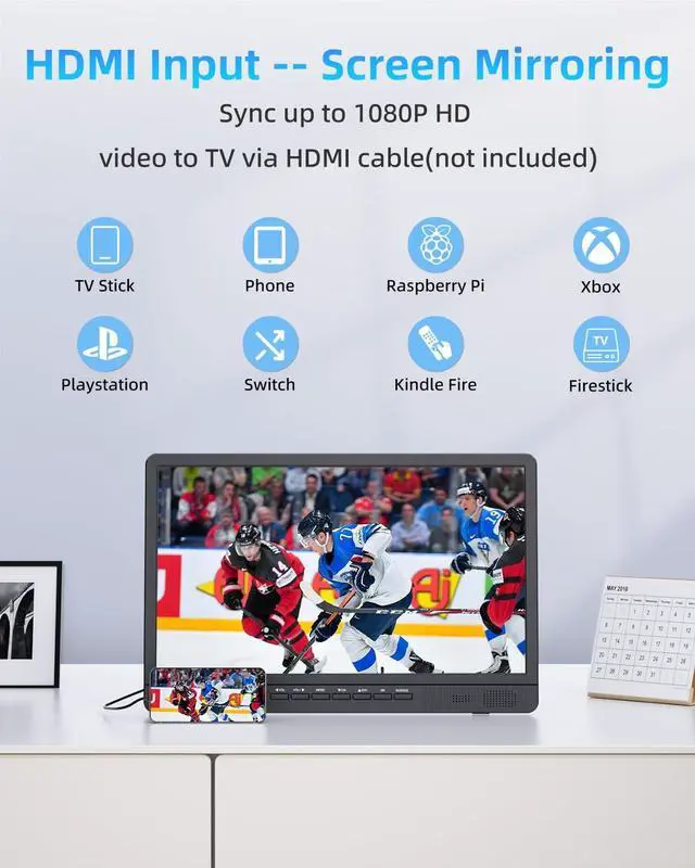 Multiple Device Connectivity: This small, portable TV has built-in HDMI, AV and USB inputs to connect external devices such as phones, computers, TV sticks, Raspberry Pi, Xbox, kindle fire, gaming consoles, DVD player, projector and USB. Whether you're watching films, listening to music or looking at photos, this TV can do it all with ease ^^ 180
