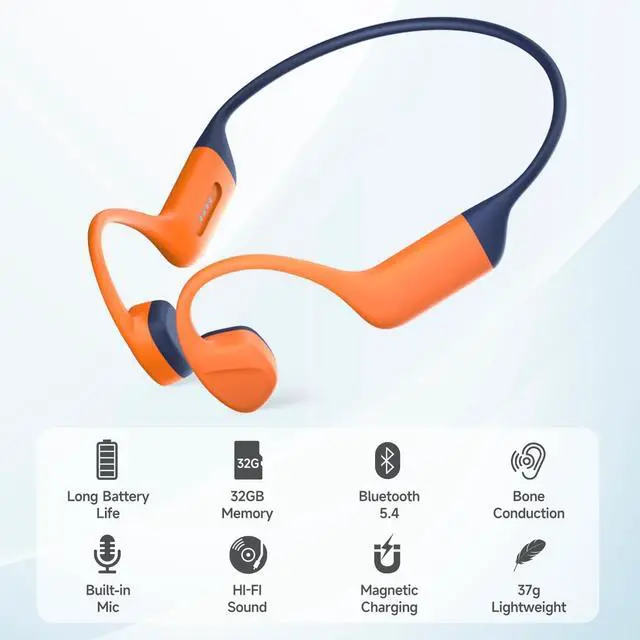 ^^ BT 5.4 Support Multi devices Stable connection Bone conduction headphones with the latest version 5.4 of Bluetooth chip, transmission range up to 13 meters, it quickly pair with all BT devices such as smartphones, tablets, smart watches and more, allows you listen to music hands-free at any time, supports connecting multiple devices ^^ 32GB MP3 Storage This bone conduction headphone built in 32G TF card, it can load more than 8000 songs, pls switch to TF card (mp3 mode) underwater, you can enjoy the amazing underwater sound quality without interruption.