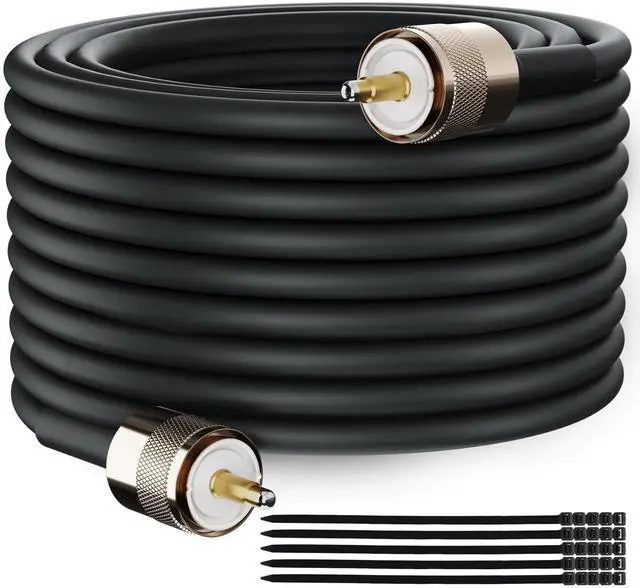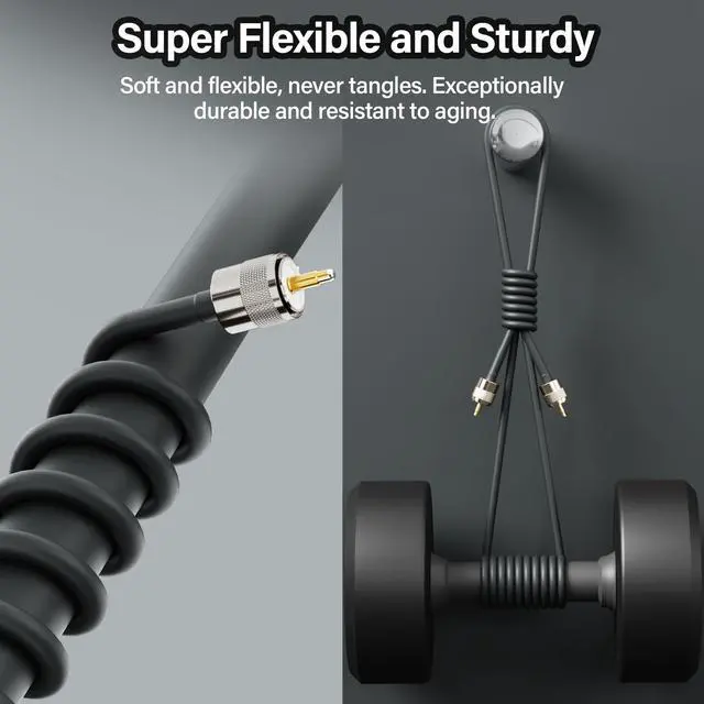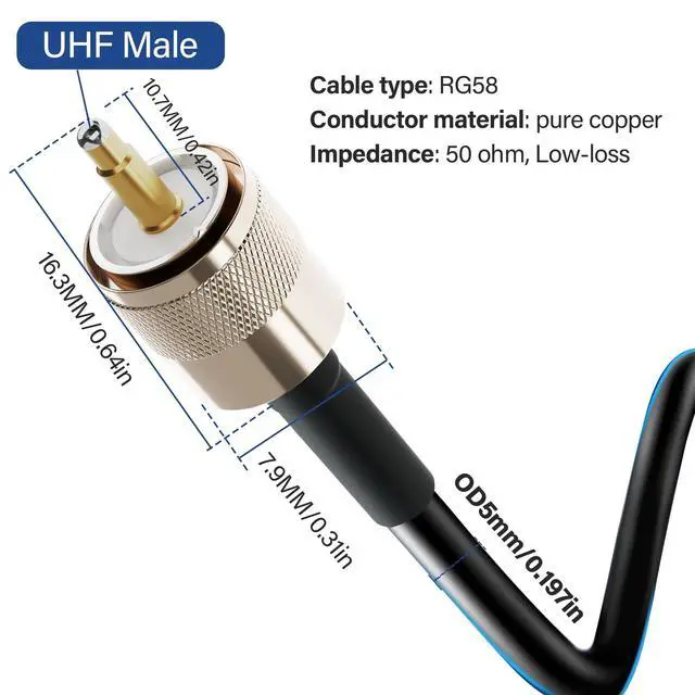 Why Choose Us: Our UHF Male PL-259 RG58 coaxial cable features pure copper conductors, a nickel-plated shell, and gold-plated brass contact pins----dual shielding (aluminum foil and tinned copper braid) that offers excellent conductivity and corrosion resistance, significantly reducing electromagnetic interference----High-quality PVC jacket that provides outstanding flexibility, allowing for easy bending without breaking----sturdy and durable, capable of withstanding extreme weather conditions such as rain, snow, and direct sunlight----The connector-to-cable structure is extremely secure, making installation easy, and the terminals can be connected and disconnected effortlessly.