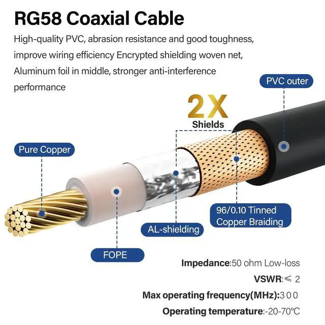 ^^ Superior Performance: To ensure optimal signal transmission, our coaxial cable uses high-quality, low-loss RG58 cable with an impedance of 50 ohms----resistant to chemical corrosion, freezing, and sun damage, making it suitable for extreme temperatures ranging from -20C to 70C----The cable can also withstand high tension. Supporting frequencies up to 3000MHz, it is perfect for various HF/VHF devices, ensuring stable and clear signals for your equipment.
