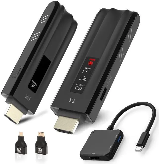HDMI: Type-c 4-in-1 docking station / Micro HDMI 8K Adapter / Mini HDMI 8K Adapter. Notably, smartphones can also cast screens! With it you will have both wireless HDMI and USB-C wireless, providing you with more convenient connection and adaptability to various usage environments. ^^ 165ft/50m Max Wireless Transmission Wireless video transmitter and receiver distance can reach up to 165ft/50m, using dual-band chip ( 2.4G /5G) transmission protocol, signal transmission is more stable.