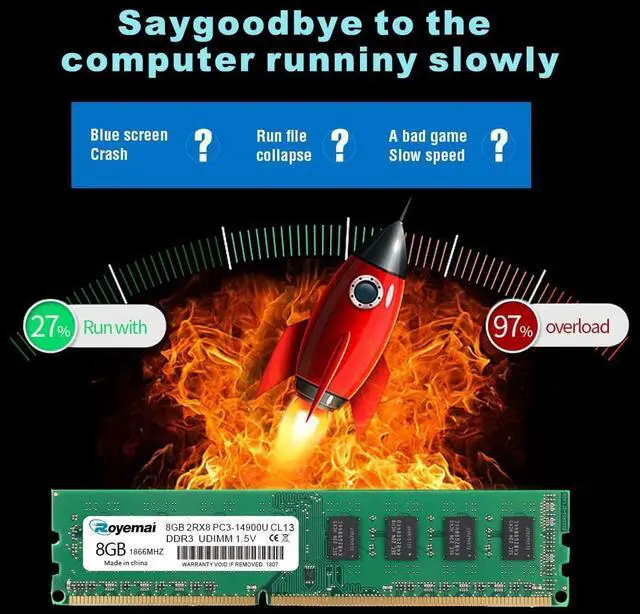 Please Kindly Note: In case the RAM cannot fit your computer, please ensure the parameters before you purchase, such as the RAM model, RAM slot and maximum memory of your computer. High StabilityHigh-quality originals, strict process. All chips from large brands, through strict testing and screening testing. Advanced electroplating process is applied on the connecting finger will improve corrosion resistance and electrical conductivity. After Long-time burn in test and temperature tolerance test aiming at major system platform, it approves that ROYEMAI memory owns high stability and performance. Faster and SmootherROYEMAI RAM is designed to help your system run faster and smoother, one of the easiest ways to improve your system's performance. Load programs faster, increase responsiveness, run data-intensive applications easily and increase your desktop's multitasking capabilities. After install larger memory, computer will respond noticeably faster, particularly with lots of windows open. High CompatibilityTo make sure itll be compatible with Intel, AMD System well, ROYEMAI RAM has been through compatibility testing with all popular brands of motherboards. Test results show that memory is able to offer superior performance and high stability required during long time operation for any brand computer.