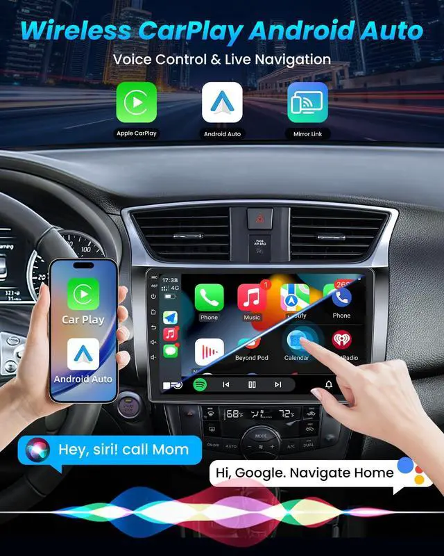 Car Stereo: Designed for Nissan Sentra 2013 2014 2015 2016 2017, featuring Android 13 OS, 10" IPS HD touchscreen (1280800). 8CORE 4GB RAM + 64GB ROM for smooth operation, and Includes a backup camera and microphone. ^^ Wireless/Wired CarPlay & Android Auto with