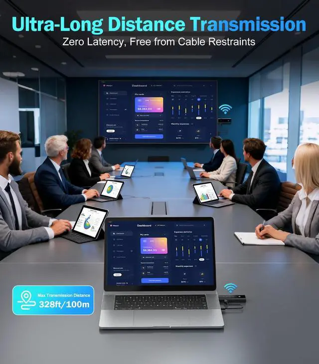 328ft Range via 5G+ 2.4G Dual-band This Wireless HDMI adapter powers by 2.4G +5G Dual-band, Dynamic Stability Equalizer Engine, and high-performance signaling hardware, It delivers stable, wall-penetrating signals with strong anti-interference capability. It boasts 328ft/100m transmission range3x farther than standard 30m! perfect for large meeting rooms, classrooms, and whole-home AV setups, all without messy wiring.