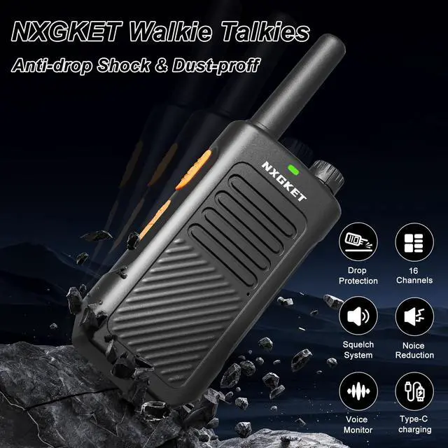 Multi-features: NXGKET walkie talkies come equipped with a variety of advanced features such as volume control, auto squelch, memory function, channel scanning, low battery alert, and drop protection. With long-lasting battery life and a stable long-range connection, theyre the ideal communication tool for both indoor and outdoor use. ^^