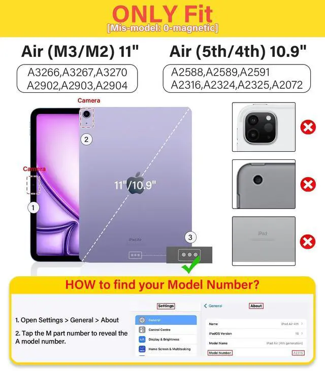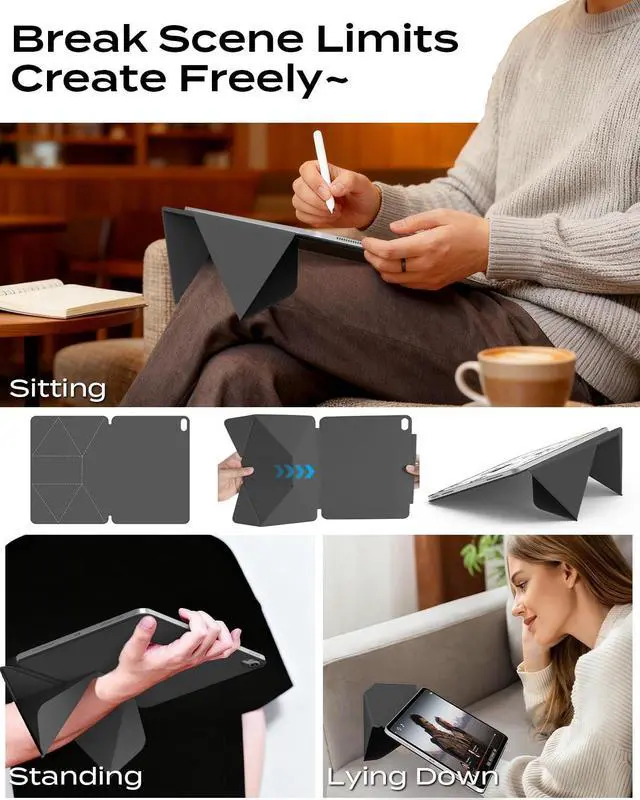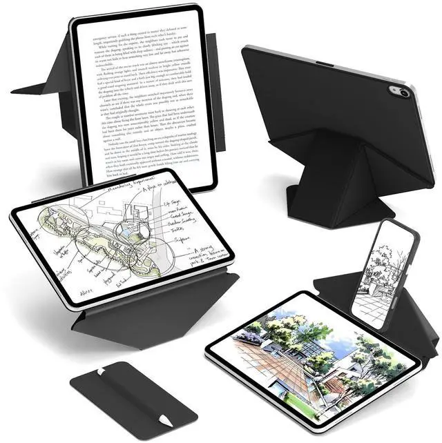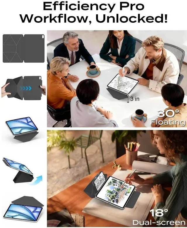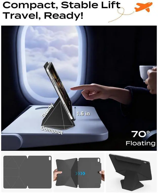 Model Number: A3266/A3267/A3270/A2902/A2903/A2904/A2588/A2589/A2591/A2316/A2324/A2325/A2072. ^^ 20+ Dynamic AnglesNo more ImpossibleBreak the impossible. This Dynamic Folio unlocks 20+ angles for your iPad Air 11-inch (M3/M2), whether youre working on dual screens, sharing overhead in a meeting, or resting it stably on your arm or lap. Easily flip between landscape & portrait (15-80) to match any task, anywhere. ^^ Ergonomic lift-Comfortable useSave your neck. The Origami case offers two ergonomic lifts: 1.6 raises your iPad Air 5th/4th gen screen to eye level for work and calls; 3 is perfect for looking downfollow recipes, watch videos on a low table, or share your screen, all strain-free. ^^ Safer Magnets & ClaspStay secure. Your iPad Air M4 11" case features a slim back with 100+ ultra-strong magnets. This delivers a fail-safe hold. The detachable magnetic pen holder locks your pencil in place anywhere you want, saving iPad battery and giving you total peace of mind. ^^ Slim & Compact DesignYour trusted travel companion. At just 330g and 0.20 thin, its easy to take your iPad Air 5th & 4th generation 10.9" case everywhere. The built-in triangle stand locks it stable in tiny spacefits perfectly on a flight tray, or turns any cafe table into a steady desk. ^^ Anti-Scratch & Stain FabricMade with advanced eco-material, this smart case for iPad Air M3 & M2 resists stains, scratches, and fingerprints. Its textured surface provides a secure, anti-slip grip. Spills wipe away easily, keeping your case clean and iPad air M4-11" safe.