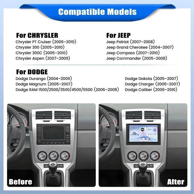 Android 15 Car Stereo for Jeep Grand Cherokee/Chrysler Town&Country 2008-2016/Dodge Grand Caravan, Challenger, Caliber, AvengerThe carplay car stereo fits for Jeep Patriot. Android 15 system, 8'' Capacitive touch screen, 2G RAM+64G ROM, running smoothly in colleges and universities. A variety of EQ sound effects scene selection. Capacitive touch screen, 1024*600 high resolution, Support 1080p video, will provide you the Excellent experience in the car ^^ Built-in Android Auto&Carplay&Mirror LinkTouchscreen car radio for Jeep Grand Cherokee support wireless Carplay and Android Auto. Just connect Bluetooth, you can project the contents of your phone to the large screen of the host.