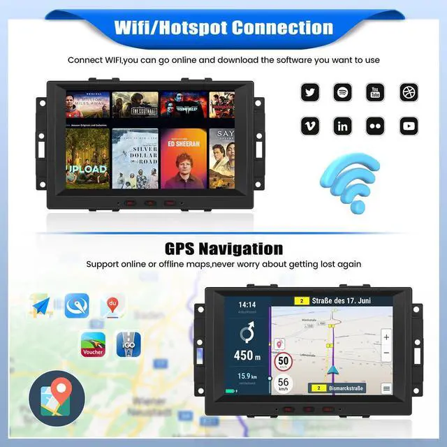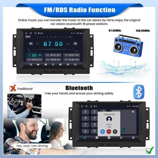 • Built-in Android Auto&Carplay&Mirror LinkTouchscreen car radio for Jeep Grand Cherokee support wireless Carplay and Android Auto. Just connect Bluetooth, you can project the contents of your phone to the large screen of the host. Easily access your phone to make calls, navigate, play music or manage other apps via Siri/Gg controls.Mirror link function, Android connects via USB and WiFi, Ios connects via WiFi
