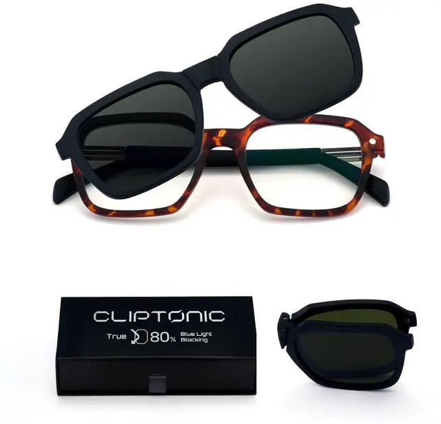 CLIPON 2IN1 DESIGN These blue light blocking glasses flip to polarized sunglasses with one quick clip. Dual N52 magnets hold firm in subway gusts; a center latch lines the clip every time. Featherlight TR90 frame and spring hinges hug most medium faces. Carry one pair, not twomagnetic clip on tech keeps pockets light and vision sharp. ^^ EYES STAY FRESH, MIND STAYS SHARP Clear lenses are tested to reduce approximately 80% of blue light transmission under representative blue light conditions while maintaining high visible light transmission for crisp, natural vision. UV400 protection blocks up to 99% of UVA and UVB rays.