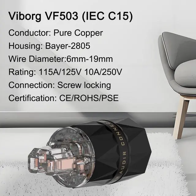 The Viborg VF503 HiFi power connector features a pure copper conductor that is designed to provide a high-quality, stable power supply to your audio equipment. ^^ They are rated for 15A/125V 10A/250V AC and comes with screws locking to ensure a tight and secure connection that won't come loose over time. ^^ This Hi-end Audio Power IEC C15 connector is made to be rigid, durable, and wear-resistant, with anti-corrosion properties that protect it against environmental factors and extend its lifespan. ^^ The C15 Audiophile power connector is designed with exquisite craftsmanship and features a diamond appearance that adds a touch of elegance to your audio system.