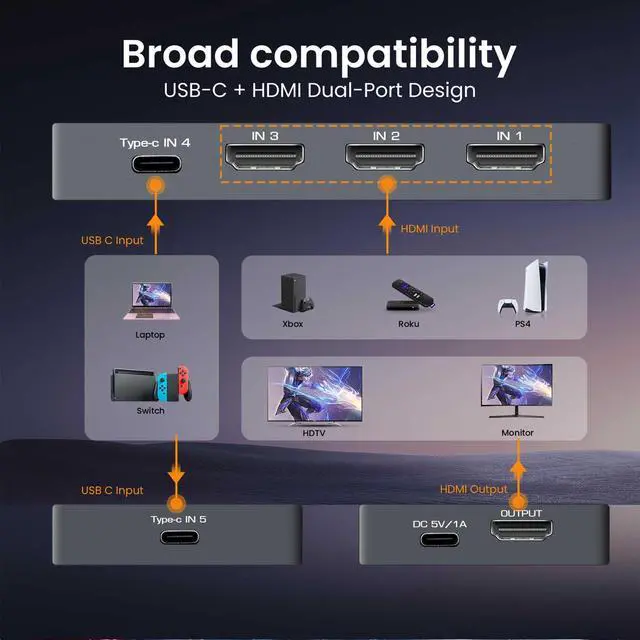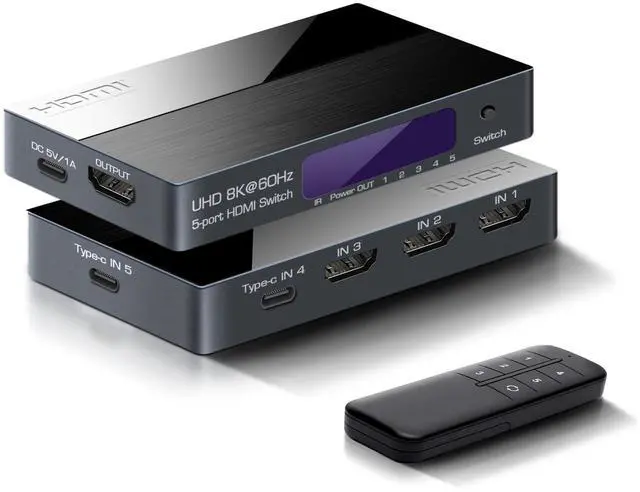 Ultra HD 8K ResolutionHDMI & Type-C switch Supports 8K@60Hz, 4K@120Hz, 4K@60Hz, 4K and 1080P with a blazing-fast 48Gbps transmission rate. Backward compatible with all HDMI standards for seamless connectivity with your 4K/HD devices. ^^ 5-in-1 Seamless Switching Easily switch between 3 HDMI and 2 Type-C inputs (like laptops, gaming consoles, and streaming devices) with the press of a button. LED indicators clearly display the active input. More without constantly plugging and unplugging cables. ^^ Cable RequirementsFor best 8K@60Hz or 4K@120Hz output, use certified Ultra High Speed HDMI 2.1 cables (48Gbps) under 3 meters (10 feet), or Thunderbolt 4 cables.