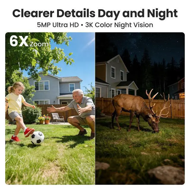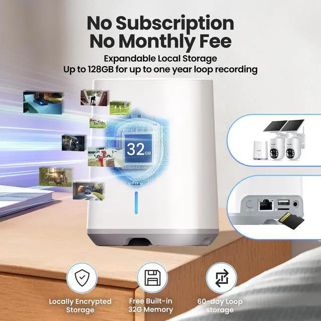 5MP Ultra HD Video with Unique Magnifier Zoom The Soliom 5MP outdoor security camera delivers clear, vibrant video day and night. With the Magnifier Zoom, you can tap the screen to enlarge specific areas and view detailed images from up to 30 ft away in real time, and track the magnified details as they move across the screen ^^ No Subscription, No Monthly Fees with Soliom Base All recordings are securely encrypted and stored locally on the Soliom Base, with no subscription or hidden costs. The included 32GB local storage supports up to 2 months of loop recording.