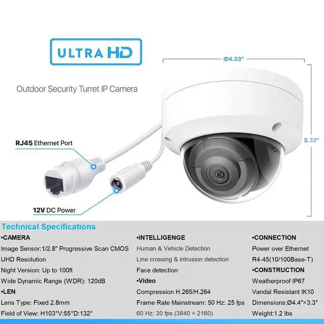 Stunning 8 MP High-Resolution Clarity: Capture every detail with exceptional precision thanks to the 8 MP resolution. Whether monitoring your home or business, enjoy crystal-clear imaging that reveals critical details like faces and license plates, ensuring comprehensive security coverage.