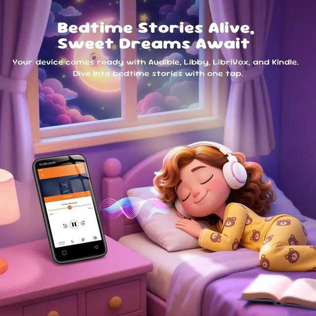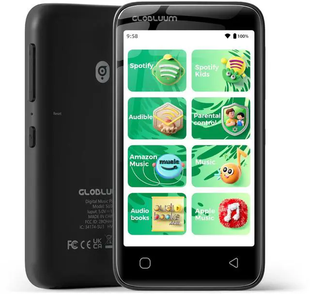 to go: preinstalled Spotify Kids, Spotify, Music, Apple Music, and YouTube Music; sign in and play; no setup needed; parents save time ^^ Kids' sleep, easier