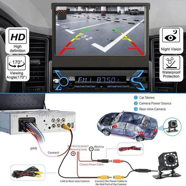 Our single din head unit receiver has stronger night vision effect, waterproof, and have 170 angle of the lens, no blind surveillance, offering you a broader field of vision in the vision in the process of reversing. ^^ 7 inch HD Flip Out Car Stereo- 7 inch HD digital LCD folding touch screen, flip out car stereo screen, dynamic menu interface, this car audio receiver which builds in high quality stereo audio, allow easier access to high fidelity audio.