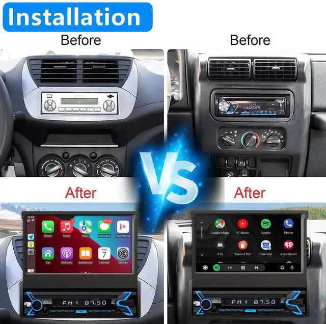 • Compatible with Carplay & Android Auto- The single din car stereo with bluetooth enables the head unit to be a display and a controller for an iOS/Android device. Connecting via USB data cable, single din car radio flip out touchscreen can access your phone functions, such as music, GPS navigation map, calls, messages, and also implement voice control. A smarter, safer way to use your phone while you drive