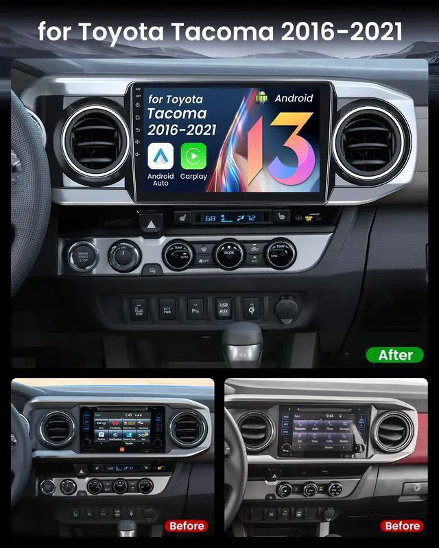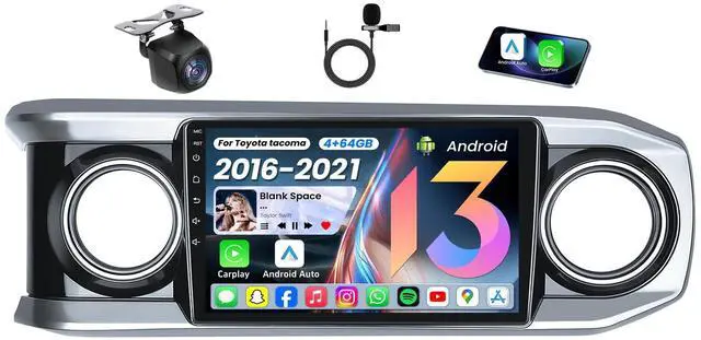 Upgrade for Toyota TacomaOur car stereo radio for Toyota Tacoma 2016 2017 2018 2019 2020 2021. It comes with a comprehensive plug-and-play kit that includes all components for installation. Retains factory steering wheel controls, 1080P AHD backup camera, and factory antenna adapter. ^^ Wireless/Wired Carplay & Android AutoEnjoy seamless integration of your smartphone with built-in wireless CarPlay and Android Auto. Access navigation, music, calls, and messaging apps from your phone directly on the car stereo's screen, all while keeping your hands on the wheel. ^^ Large Storage Radio 10.1 inch 1280 * 800 HD touch screen car radio, built-in android system, With 4GB RAM + 64GB ROM (high performance), Large storage space allows you to download and install multiple apps that you love through the Google store.