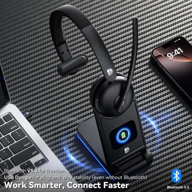 Flexible Options: The Dytole wireless headset with mic for work supports both Bluetooth 5.3 and a 2.4G USB dongle. Easily connect to laptops, mobile phones, and other Bluetooth devices. If the computer does not support Bluetooth, simply use the USB adapter to achieve a stable connection (only one device can be connected at a time). With a reliable 49-feet, wireless range, the wireless headset are ideal for professionals who need to handle Teams/Zoom meetings, customer calls, and presentations ^^ Two Charging Methods & Long