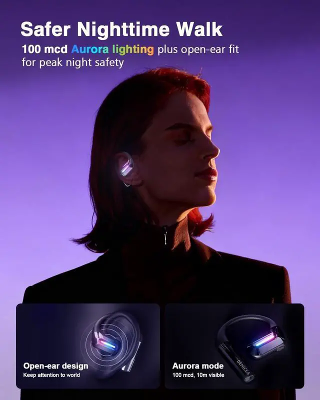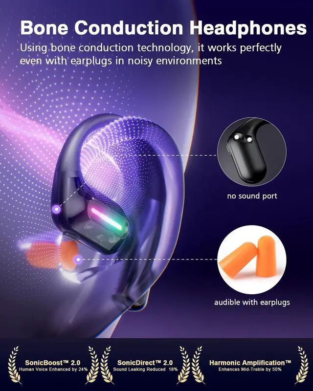 [True Bone Conduction Tech for Superior Sound] Our bone conduction headphones deliver crystal-clear audio through vibration. SonicBoost Tech 2.0 enhances vocals by 24%, making conversations and lyrics sharper. SonicDirect Tech 2.0 reduces sound leakage by 18% to ensure your privacy, while Harmonic Amplification Technology boosts mid-to-high frequencies by 50% for a richer, more detailed audio experience. ^^ [Open-Ear Design with Vibrant RGB for Safer Night Sports] Our open-ear headphones feature a 100mcd dynamic lighting design, offering brightness comparable to a single bicycle taillight LED. This significantly increases visibility during night runs or rides, ensuring you remain clearly seen in low-light environments.