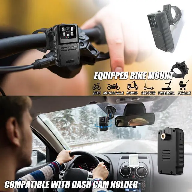 /It is equipped with the instantly No LED mode that is switched by pressing two buttons at the same time to close the LED indication. ^^ Powerful Battery LifeSport Recorder with Ultra-long Working Time This wearable cop cam built-in 1050mAh rechargeable battery. It can record for about 5 hours with one charge, and a standby time of up to 6 hours, you can charge the mini camera and record video at the same time. When you want to record more than 5 hours, it supports recording while charging. ^^ Normal Clip + Screws Clip + Bike Mount ClipUsing a quarter screw hole for the replaceable clip, it can be suited for a car holder or a bicycle holder for it, also can combine it with the bike mount clip that can be better for your bike travel recording.