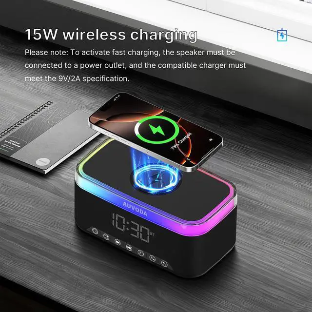 15W Fast Wireless Charging & 13-Color Night LightingMore than just a bluetooth speaker, AUVODA S300 is the ultimate bedside companion. This versatile bluetooth speaker features 15W wireless charging for