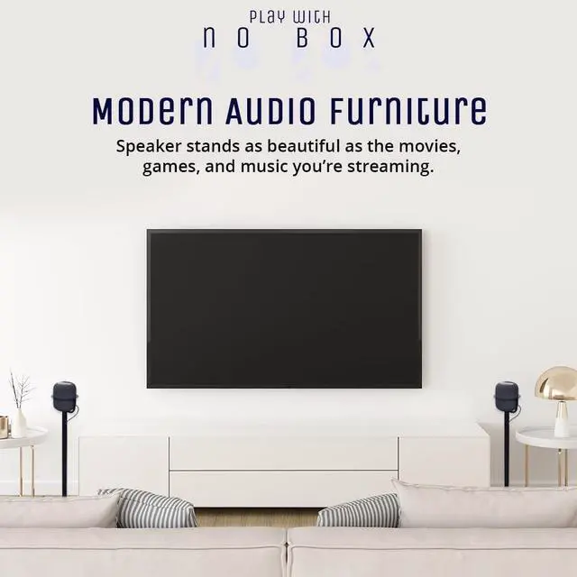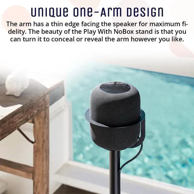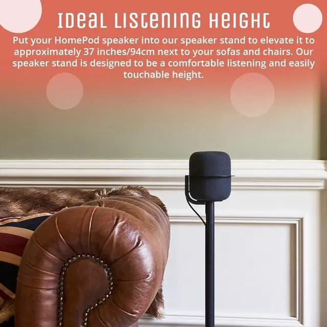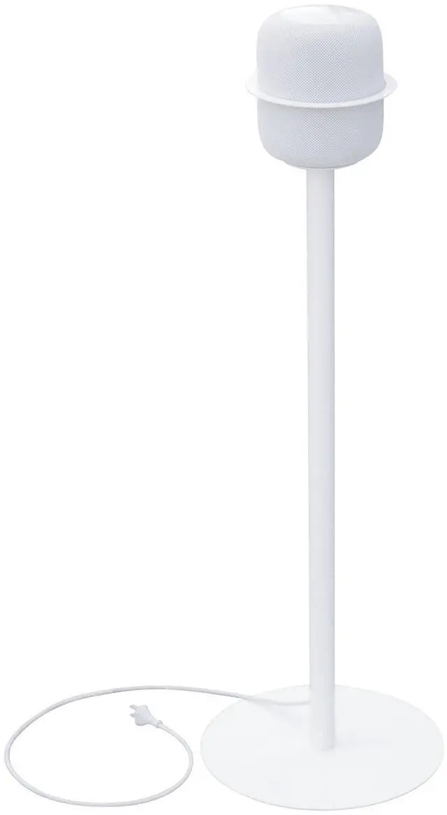 OPTIMAL LISTENING HEIGHT Elevate your Apple HomePod (Gen 1 & 2) to the perfect 37-inch floor stand height for rich, immersive sound. Designed to match the HomePod 2s acoustic sweet spot, this stand enhances clarity and bass response while keeping your setup elegant and functional. ^^ BUILT-IN CABLE MANAGEMENT Hide messy cords completely with integrated cable concealment. The internal cable management channel runs through the column with discreet openings at the top and bottom, keeping your HomePod stand clean and organized from every angle. ^^ SLEEK MINIMALIST DESIGN Crafted from powder-coated steel with a slim, one-arm silhouette, this modern speaker stand blends seamlessly into any Apple-inspired setup.