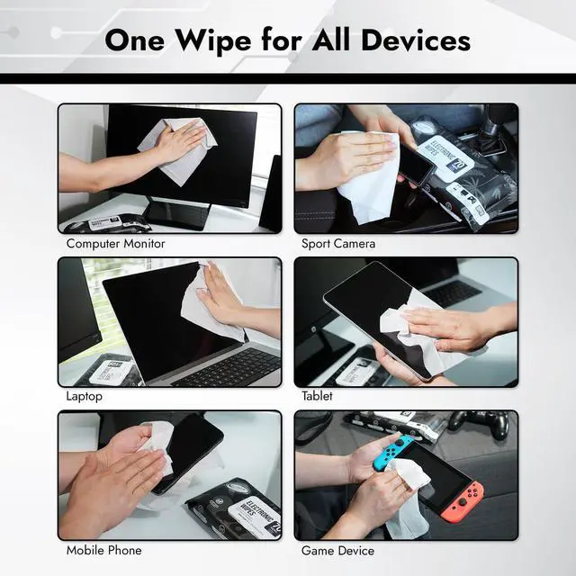 Quick Dry: These screen cleaning wipes dry quickly, making them perfect for phones, tablets, laptops, and other electronic devices. ^^ Safe on All Your Devices These electron cleaning wipess are made with soft, non-abrasive materials that lift fingerprints and oil without scratching. Use on phones, glasses, and camera lenses. ^^ Reliable for Work and Travel Use these laptop cleaning wipes at home, in the office, or on the go. Theyre ideal computer wipes for keyboards, touchscreens, and other high-touch technology wipes needs.