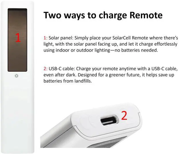 Eco-Friendly Solar Charging: Equipped with solar charging technology and a built-in rechargeable battery, this remote eliminates the need for frequent battery replacements. It also supports USB Type-C charging, ensuring maximum convenience and environmental friendliness. A charging indicator light displays the charging status for easy monitoring.