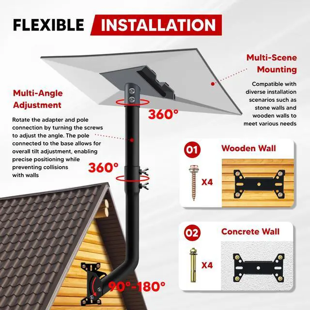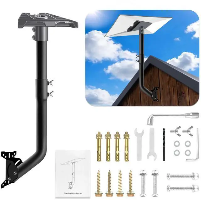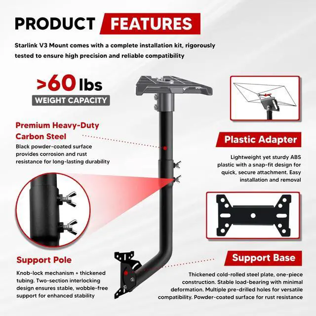 [Premium Durable Construction] The Starlink Gen 3 Mount Kit is crafted from premium heavy-duty steel with a black powder-coated finish for corrosion and rust resistance, ensuring long-lasting durability. It withstands frequent use and harsh weather conditions, guaranteeing an extended service life. ^^ [Versatile Installation Options] The Starlink V3 mount includes complete installation components with a load capacity exceeding 60 lbs. The third-generation pipe adapter supports flexible 90-180 adjustment, accommodating diverse mounting methods like walls or roofs to adapt to various site layouts and ensure stable, reliable equipment placement. The third-generation Starlink pole mount features a hidden cable port to effectively prevent cable damage.