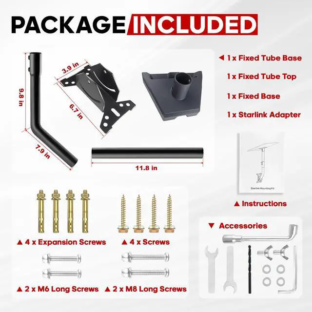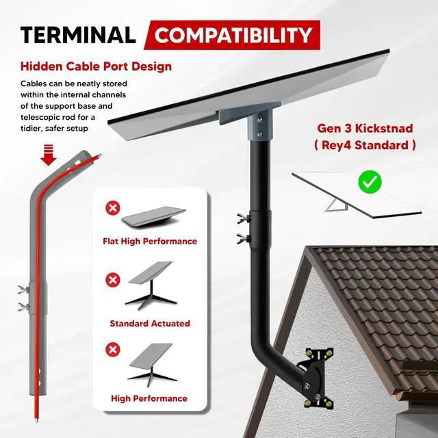 This thoughtful design not only enhances aesthetics but also shields third-generation Starlink cables from environmental wear. ^^ [Included Components] The Starlink Pole Standard Mount Kit includes a pipe adapter, pole, and essential mounting hardware. This Starlink pipe adapter undergoes rigorous testing to ensure high precision and reliable compatibility. Properly positioning the satellite dish using the Starlink installation kit maximizes signal reception, guaranteeing stable, uninterrupted Starlink internet connectivity. ^^ [Dual-Angle Adjustment Function] The pole connected to the third-generation pipe adapter can rotate to adjust the satellite antenna's azimuth angle; The pole connected to the base can adjust the overall elevation angle, enabling precise positioning while preventing the third-generation satellite antenna from colliding with walls.