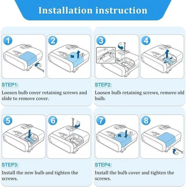 Install Your Projector Lamps: To install a projector lamp with the housing, just follow the easy steps below: 1. Make sure the projector is unplugged and sitting on a flat surface2. Loosen the screw holding the projector lamp module cover in place and remove the panel3. Unplug the old projector lamp and remove it from the projector4. Plug the new projector lamp securely into place5. Attach the panel back onto the projector and tighten the screw