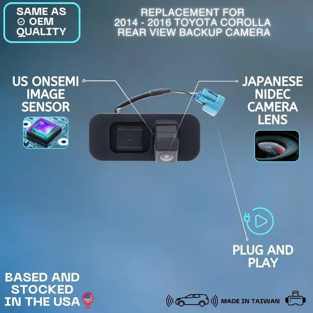 {Plug and Play} This device can be easily plugged into the existing OEM video harness. ^^ {Replaces} Backup Camera Compatible with 2014 2015 2016 TOYOTA COROLLA ^^ {OEM#} 867A002010, 867A012010, 867A0-02010, 867A0-12010 ^^ {Specs} *Angle: 170 Degrees *Waterproof Level: IP68 *Resolution: 600 TV lines *Pixel: 728 x 582 *Signal: NTSC/PAL * Illumination: 0.1 Lux light (minimum) *Power: DC 12V ^^ {Important note} We recommend contacting your local dealer to confirm that the part number you are purchasing is an exact match for the part number you require, prior to making your purchase.