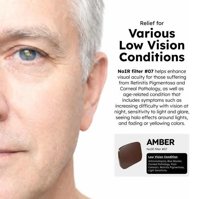 RELIEF FOR MULTIPLE EYE CONDITIONS - Ideal for individuals with achromatopsia, post-cataract recovery, retinitis pigmentosa, and corneal pathology, these NoIR Filter #07 glasses provide light filtering for various light-sensitive conditions.