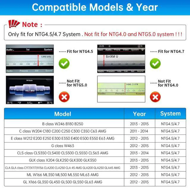 Suitable vehicle: Road Top Wireless Carplay Retrofit Kit Decoder fit for Mercedes Benz C/E/CLA/GLA/GLK/CLS/ML/GL/GLK/SLK Class 2012-2015 Year with ntg 4.5 ntg 4.7 System. Not fit for NTG 5.0 ^^