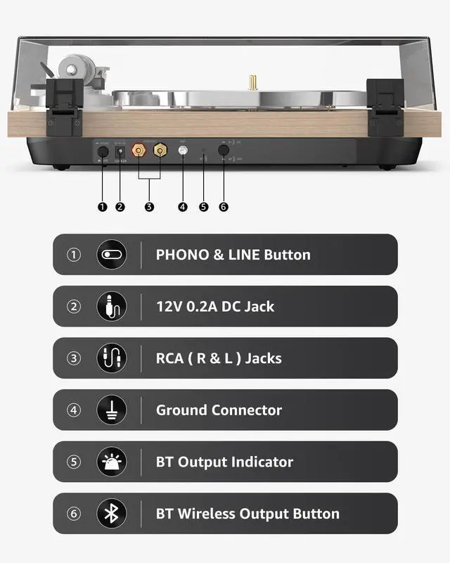Note: The counterweight is fixed to the factory Settings and there is no need to reset the tracking force ^^ [Wireless BT Output Connectivity] High-fidelity audio with Bluetooth wireless output technology. Using Bluetooth 5.3 version, automatically pair with Bluetooth speakers or headphones Bluetooth devices within the nearest range ^^ [High-End Carbon Fiber Tonearm] Audiophile turntable with carbon fiber tonearm, the one-piece carbon fiber tonearm reduces vibration, with the aluminium die-cast discs plate of turntable produce uniform inertial mass, combined with advanced HiFi systems for perfect stability and rotation ^^ [Adjustable Dynamic Anti-skate Control] Using the tonearm counterweight and advanced anti-skating system ensure precise needle placement. These ensure the stylus is balanced and rests deep in your record's groove, producing smooth stylus movement, protecting your records from damage ^^ [MM AT-3600L Cartridge Stylus] The diamond-tipped stylus cartridge is designed to produce rich sound and outstanding clarity, tracking your records grooves with precision for accurate, high-definition audio. With a standard 1/2-inch mount, you can easily upgrade the MM stylus