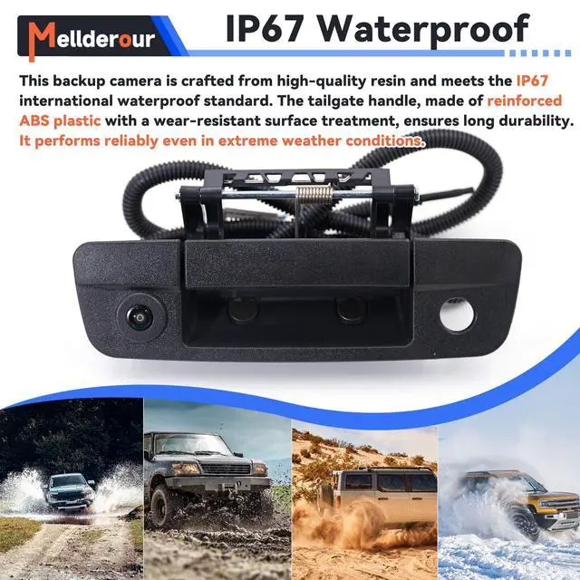 IP67 Waterproof: This backup camera is crafted from high-quality resin and meets the IP67 international waterproof standard. The tailgate handle, made of reinforced ABS plastic with a wear-resistant surface treatment, ensures long durability. It performs reliably even in extreme weather conditions.