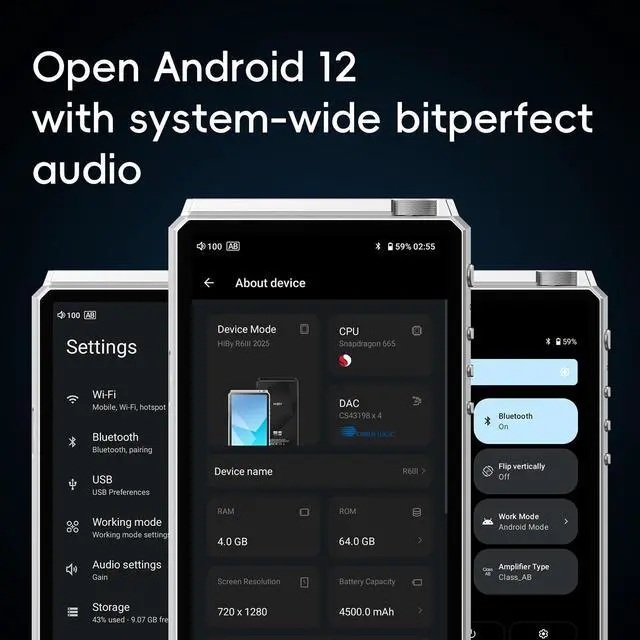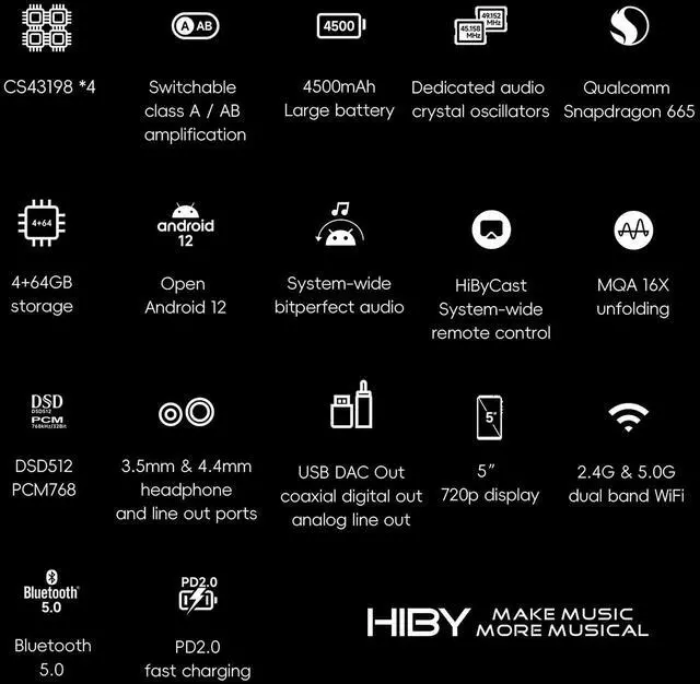 The portable digital audio player features Class A and Class AB headphone amplifiers, delivering exceptional sound performance and robust driving capability, especially suitable for large headphones and high-impedance in-ear monitors. ^^ This mp3 mp4 player consists of four of Cirrus Logic's CS43198 flagship DACs. The 8-channel monoblock output delivers top audio quality. Supports up to DSD512 native PCM 768kHz and MQA 16x playback. ^^ This Android player features Android 12 and Qualcomm Snapdragon 665, with 4GB of RAM, 64GB of ROM, and expandable memory up to 2TB. It enables effortless downloading and installation of third-party apps, ensuring quick responsiveness and smooth operation.