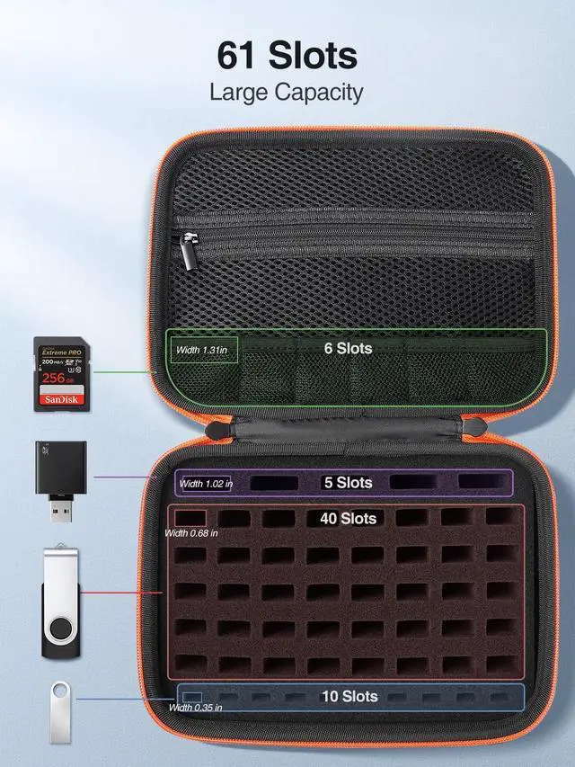 61 Slots Flash Drive CaseFits all sizes, for SanDisk, for Samsung, for Pnstaw, for Netac, for Micro, for PNY, for TOPESEL, for Aiibe, for mosDART 8GB 16GB 32GB 64GB 128GB 256GB and USB memory stick, SD card, thumb drives, coins, pen drives, jump drives ^^ USB Case OrganizerPerfect for placing the flash drive in one place, Reduce USB loss and improve work efficiency ^^ USB Drive Case with SpongeIf you have other electronic items that need to be kept in one place, just remove the sponge and store various chargers, small cameras and cable, etc ^^ Portable Thumb Drive CaseIdeal Size 8.7 x 6.3 x 3.2 in fits for Backpacks, lightweight for carrying this hard case anywhere ^^ Ideal Gifts for Business Work If you are choosing gifts for Christmas, Valentine's Day, Thanksgiving, etc, this exquisite USB flash drive holder Case is perfect for business people with a large amount of flash drives
