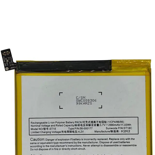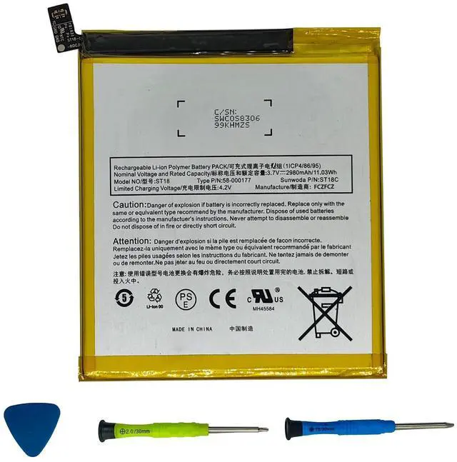 Condition: Brand New. ^^ Replacement for Part Number58-000177 ST18 ST18C ^^ Compatible with Machine Modelsfor Fire 7" Generation 2017 SR04KL Series. ^^ SafetyAll FCZFCZ products are Certified by CE, UL for safety. Each battery is factory tested before shipment and at good condition, and have its mark. Built-in circuit protection ensures both safety and stability. Each battery has high capacity to provide enduring, continual use. ^^ InstructionsPlease open the back cover of the laptop before purchasing and confirm that the original battery type is the same as the picture. Please read the battery instruction manual carefully before installing the battery. Please install the battery correctly and ensure that the battery interface and the motherboard are firmly connected. Please use the original charger to charge the laptop. After battery installation, discharge the new battery to 5% (not 0%), then charge and cycle 3-4 times to wake up the new battery.