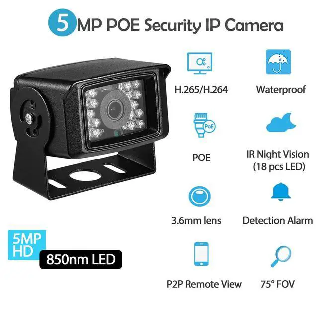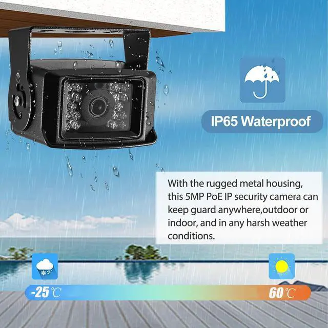 Support POE and DC Built in POE template, support 48V 802.3 af POE function, (Power over Ethernet), reduce wiring trouble. And it can also be used as a non-POE network camera, because there is also an auxiliary power interface, which can be powered by ordinary 12V 2A power supply. ^^ 5MP (2880x1616P) HD Resolution This IP camera uses a high resolution 5.0 megapixel 1/3 inch CMOS sensor with 25 frames per second, allowing you to see clearer images and details. ^^ IP65 Waterproof and Night Vision The camera is IP65 waterproof, and built in 18 IR LEDs, provides 75 viewing angle and 10M infrared night vision, can work in various weather conditions, and can also provide you with clear images in the dark.