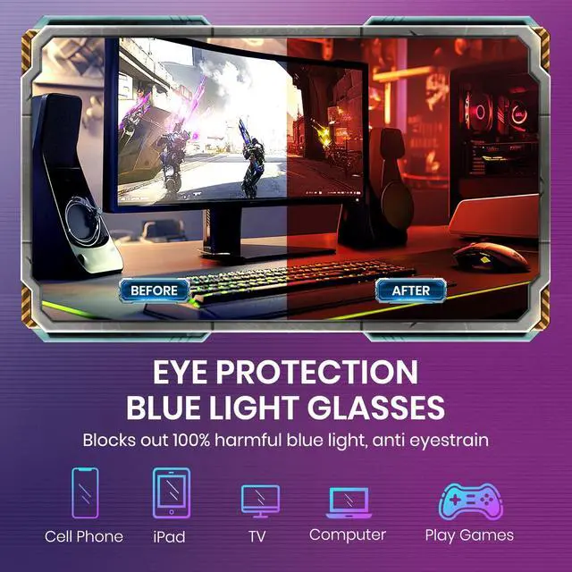 Advanced CR39 Lens Technology: Crafted from high-quality CR39 material, these lenses offer superior clarity and lightweight comfort. They efficiently filter out 99% of blue light, which is known to cause eye strain and disrupt sleep patterns, ensuring your eyes stay healthy and rested ^^ Enhanced Gaming PerformanceExperience improved focus and reaction times as our glasses reduce glare and increase visual clarity, giving you a competitive edge in your favorite games ^^ Long-Session ComfortUltra-lightweight frame combined with ergonomic design ensures comfortable wear during extended gaming marathons, letting you play longer without discomfort ^^ Complete Eye ProtectionBeyond blue light filtering, enjoy full UV400 protection and anti-reflective coating, safeguarding your eyes from multiple sources of strain and potential damage ^^ Versatile Gaming CompanionPerfect for all types of gamers - PC, console, or mobile. These glasses optimize your visual experience across all gaming platforms and everyday digital activities