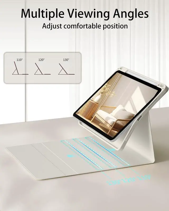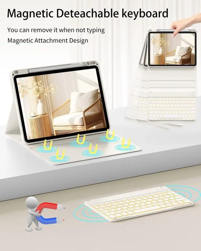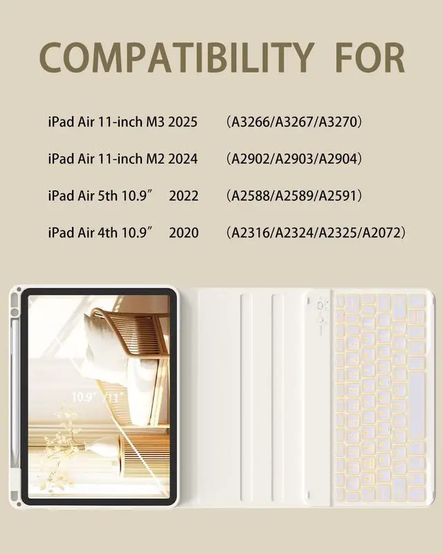 Generation 2020 Model: A2316/A2324/A2325/A2072). It is Not compatible with any other devices. Please check back bottom of your iPad to find the model number. ^^ Adjustable 7 Colors & 3 Modes Backlit KeyboardThis iPad keyboard case is designed with 7 different colors and 3 adjustable modes, allowing you to adjust the applicable color to illuminate the keyboard even in dim light for easy typing, you can choose your favorite color and mode, easy to switch to make it more convenient for you to use and bring you a different visual enjoyment. ^^ Multiple Viewing and Pencil Holder Keyboard Case 11"-the keyboard is magnetically attached and very versatile and the thoughtful design easily adjusts to whatever comfortable angle suits you best. That makes the IPad work like a laptop, so it's perfect for working, typing and editing or watching videos. It has a pen slot inside to prevent the apple pencil from being lost, grab your Apple Pencil, Pencil Cap and Adapter effortlessly whenever you want, easily to carry your with your device. ^^ Magnetic Detachable Keyboard & Long Life Battery The magnetic for iPad keyboard and case are separated, magnetically attached, the keyboard can be removed from the case.