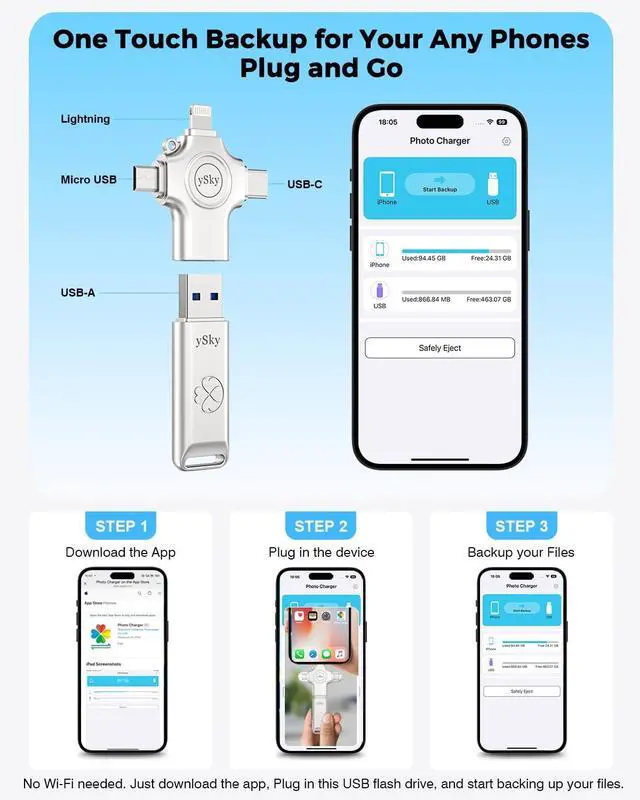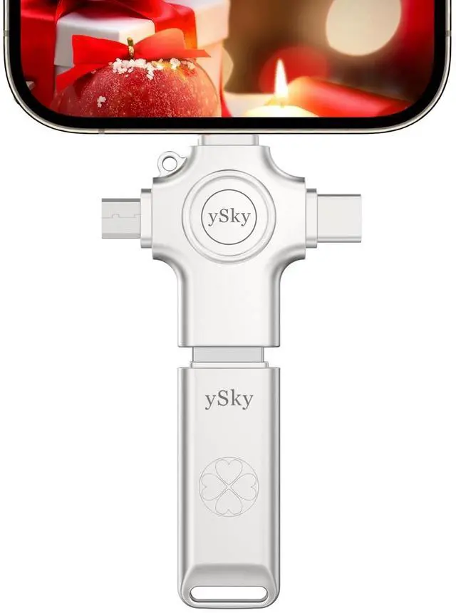 USB Flash Drive +phone Charger APP =Safely Free Up Space for iPhone iPad with 64G External Storage -- If you almost used up all space on your iPhone or iPad, this photo stick for iPhone helps to expand your memory at full storage with 64GB. And usb memory stick for photos is also a great partner for traveling photographers editing on iPad. Using this memory device for your iphone, iPad or Computers, no worries with the iPhone storage anymore! ^^ Unique 4-in-1 Interfaces Design Wide Compatibility For iPhone MemoryySky usb stick comes with USB/lightning/USB-C/micro USB interfaces, which is convenient for data transmission between different devices and gets rid of the shackles of data cables and iCloud.