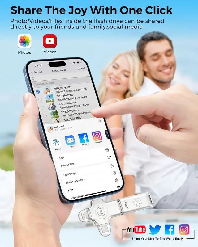 This Photostick provides a convenient way to work seamlessly with various devices. Only one ySky 4in1 flash drive can work for your whole family. MFi certified Photo stick for iPhone is Compatible with iPhone 17/16/15/14/13/12/11/8/7/6 Series, SE/XR/XS/XS Max/X/5S, iPad 5/6/7/8/9/10, Mini 2/3/4/5/6, iPad Air/iPad Pro Series, iPod, Mac, PC & Laptops, OTG Android phones ects. ^^ Auto One-Click Backup Stick, Photos/ Videos /Files Backup Easily and Stably by ySky Photo Stick for iPhoneThe photos videos are very precious, this USB memory Storage stick will be essential to back them up.